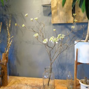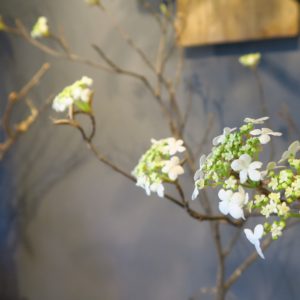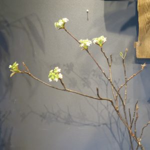 ブワッとにぎやかな枝ものではありませんが、枝先にアジサイに似た小さな花を咲かせ、そのうち小さな葉も展開してきます。